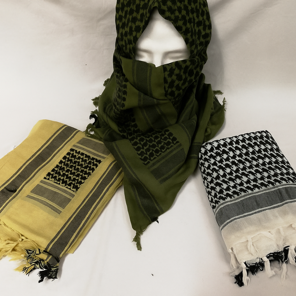 Realizzata in cotone morbido e resistente, la kefiah è pensata per adattarsi a diversi stili e stagioni. Può essere indossata come sciarpa avvolgente nelle giornate fredde, come copricapo nelle giornate soleggiate o come tocco distintivo per arricchire qualsiasi outfit. Le combinazioni di colore donano un carattere unico a chi la indossa: il verde/nero richiama la vitalità e la speranza, il giallo/nero trasmette energia e luce, mentre il bianco/nero rappresenta le disuguaglianze e il rispetto delle varie culture. Nella storia recente è stato adottato dalla popolazione Palestinese appartenente alla cosiddetta "Striscia di Gaza" nella guerra israelo-palestinese.