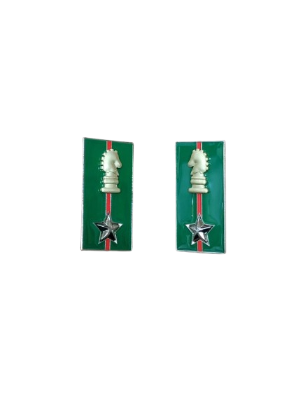Sul fondo dei due campi colorati spicca, in metallo dorato, il cavallo rampante, emblema del “Pavia”. Lo stesso simbolo che campeggia sul fregio del basco trova qui una versione più stilizzata, ma altrettanto significativa: il cavallo, proteso in avanti, incarna l’energia in movimento, la volontà di avanzare e superare ogni ostacolo. È il segno della tradizione equestre che, pur in un reparto di fanteria, simboleggia l’agilità, la prontezza e lo slancio morale dei suoi uomini e donne.